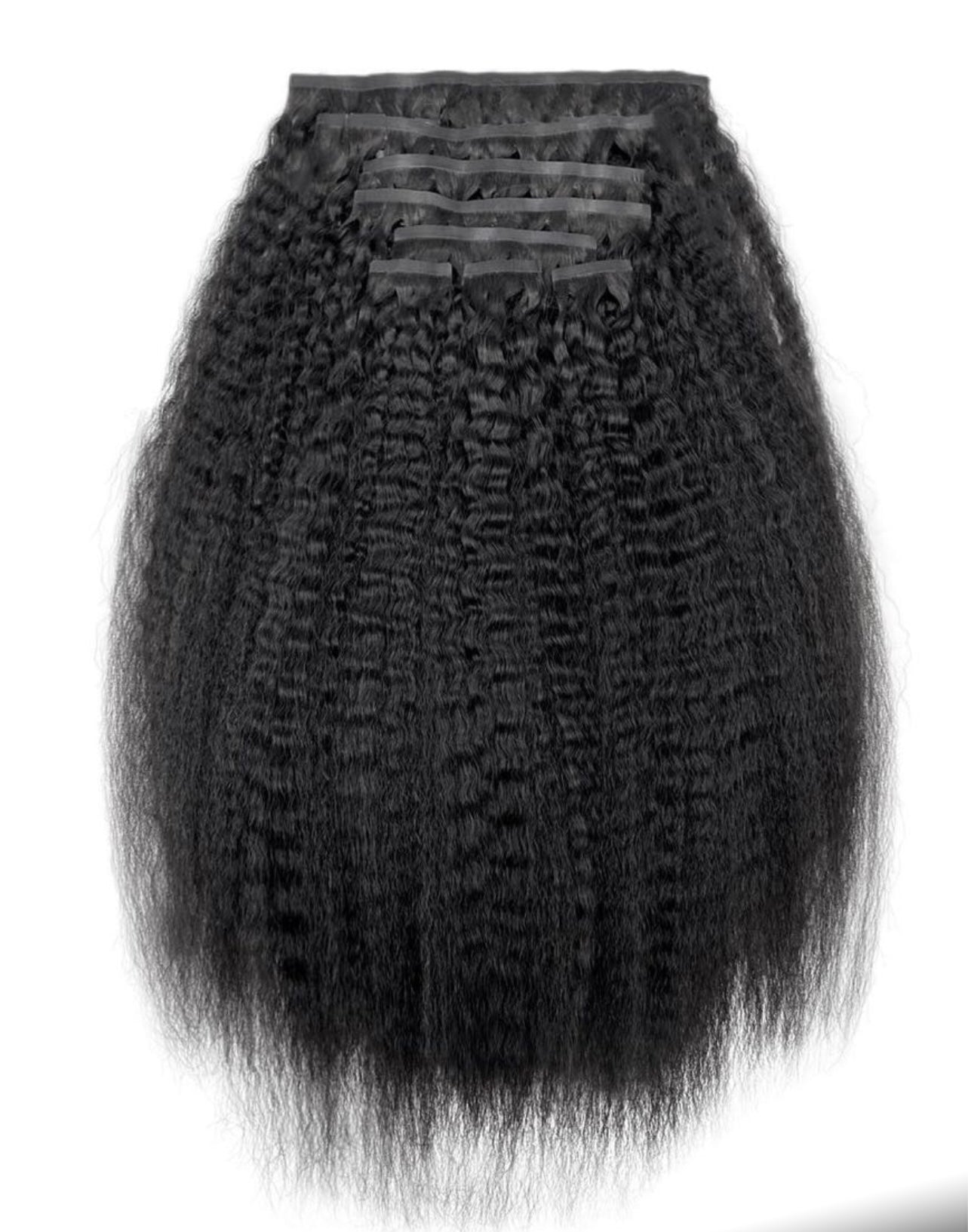 Our Designer Kinky Straight Texture Seamless Clip Ins Is a naturally textured texture that gives a natural look & is for someone that wants a textured look & can be worn with a straightened look or worn in its natural texture & a great way to add instant length & volume. Each set comes with 9 pieces per set 150 grams .Our Designer Seamless Clip Ins can be colored. We recommend 2 sets for thick hair & for someone that wants a fuller look. Processing & Shipping takes 14 days . All Sales Final